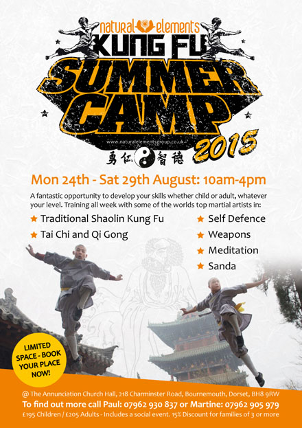 Missing the fun & experience of last years Summer Kung Fu Camp in Woldingham? Then worry not as we are running our Summer Kung Fu Camp right here in Bournemouth in August of this year! A great chance to improve your level of skill with 6 hour-long days full to the brim with Kung Fu training, meditation, Tai Chi, Qi Gong, San Da, acrobatics & weapons. We'll also be following our old tradition of having a social event at the end of the week - eating food and enjoying an activity together, all included in the price. The best bit? You get to sleep in your own bed!